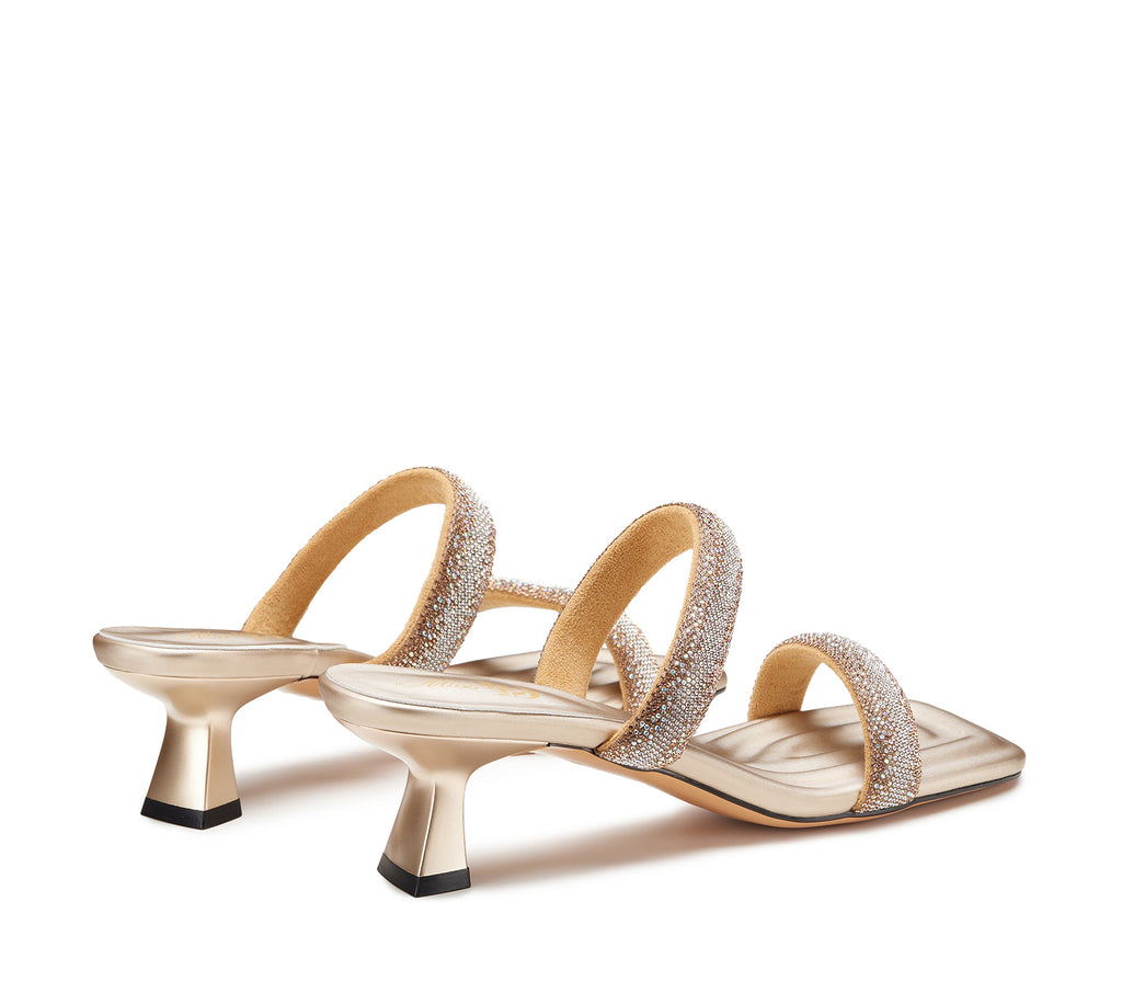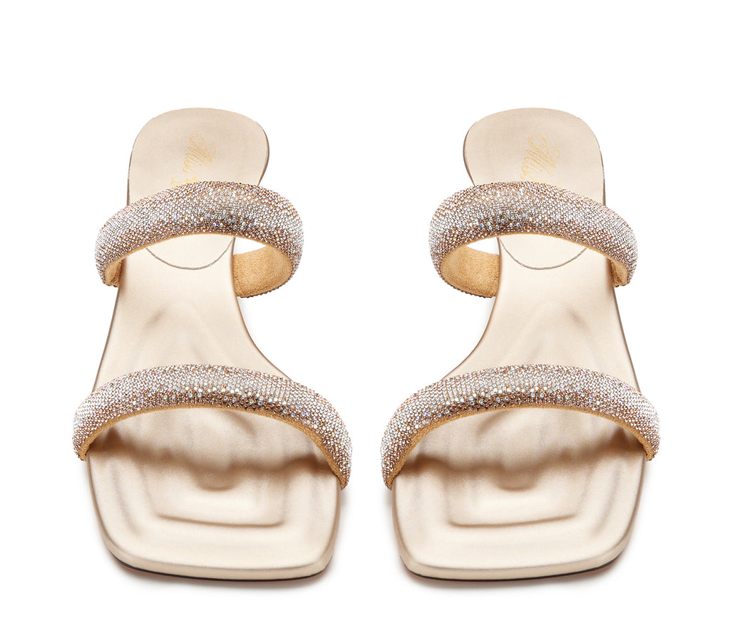 Champagne-tone sandal with square toe and two rhinestone-embellished bands arranged in parallel. The essential design is brightened by the sparkling details, ideal for special occasions or to add elegance to an everyday outfit.