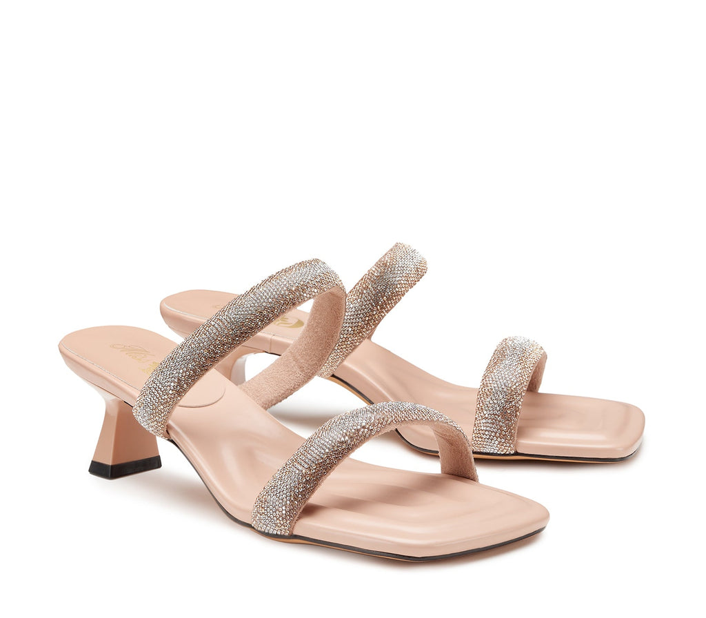 An elegant sandal with a powder pink base and squared toe. The two parallel bands, embellished with rhinestones, gently embrace the foot, giving light and sophistication. A feminine and sophisticated style, perfect for an evening look with a glamorous touch