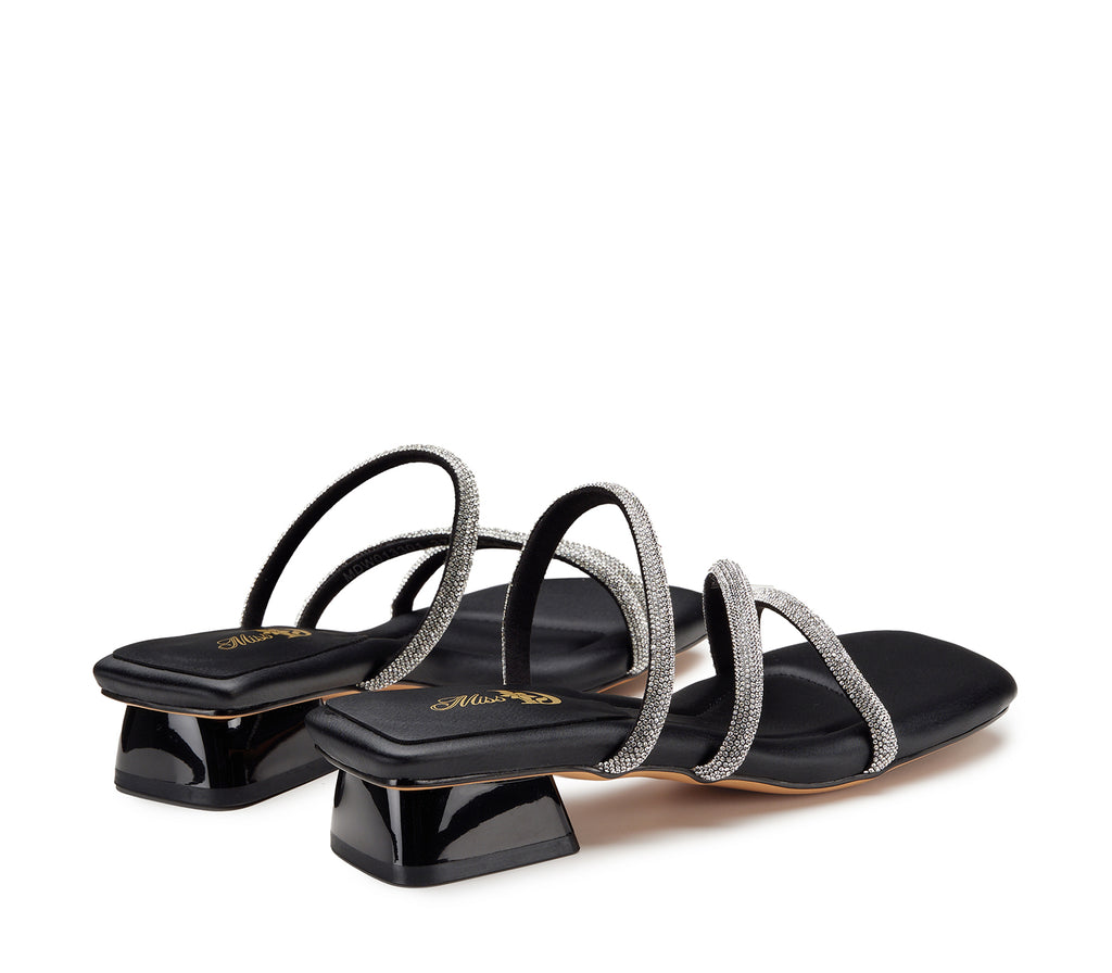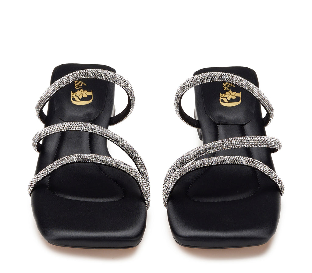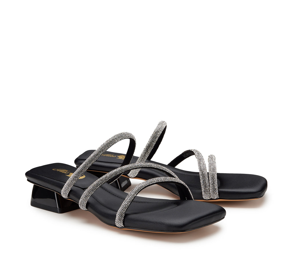 Seductive and sophisticated, this black sandal stands out for its three thin straps embellished with rhinestones that create a refined play of light. With its modern line and bright contrast, it is the ideal accessory for evening outfits that want to combine grit and elegance.