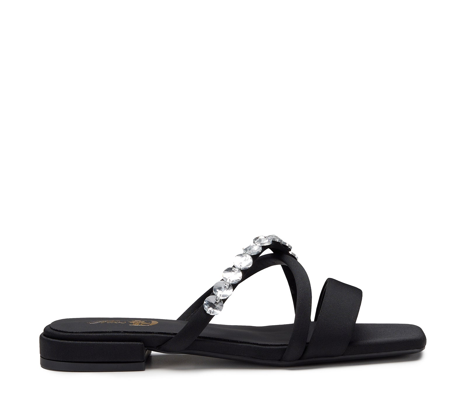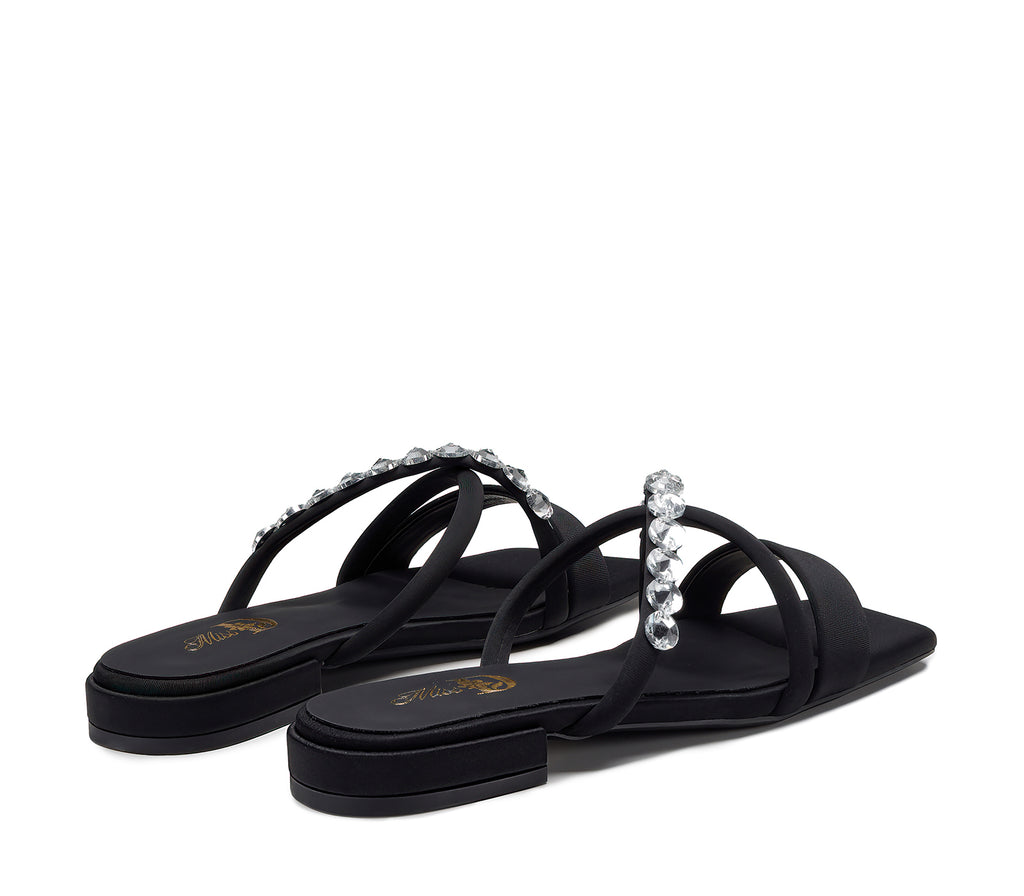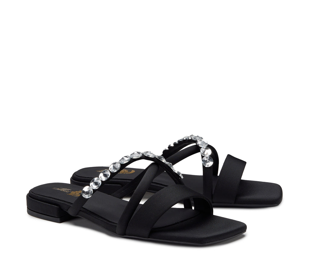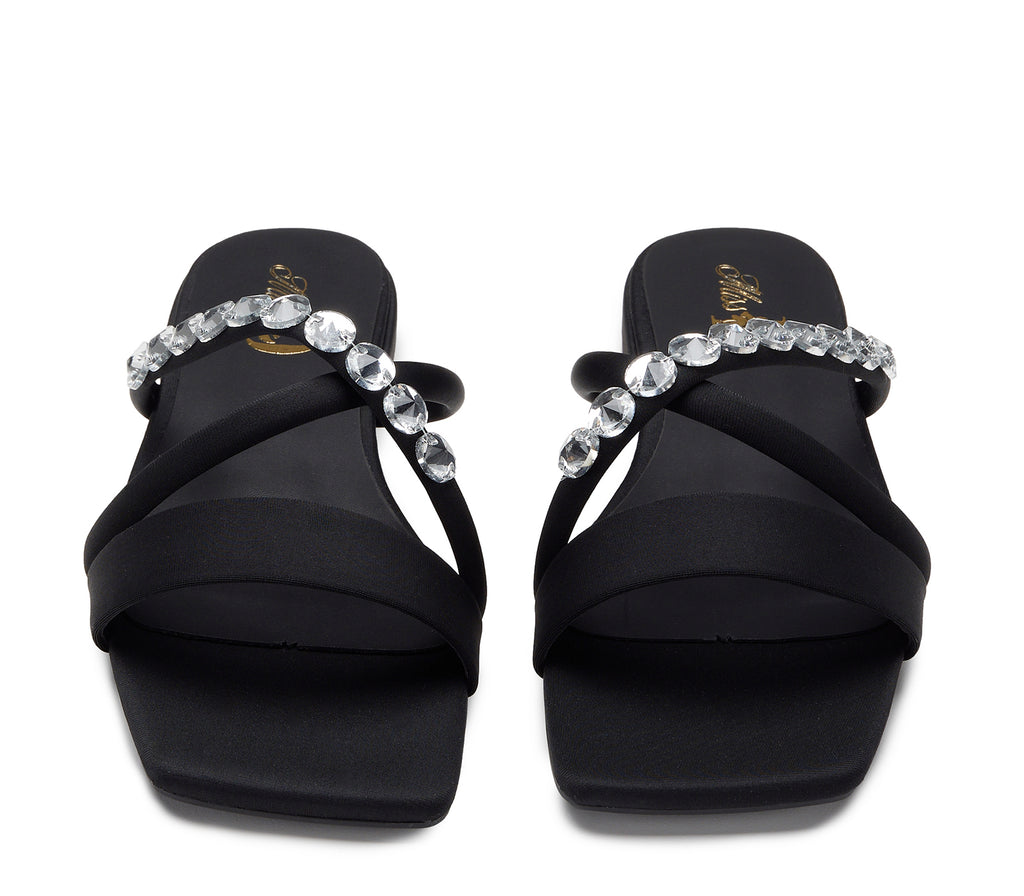 Elegant and contemporary, this black sandal stands out for its essential silhouette with three thin bands, one of which is decorated with sparkling rhinestones. The contrast between the matte black and the light rhinestones creates a perfect balance between understated and glamorous.