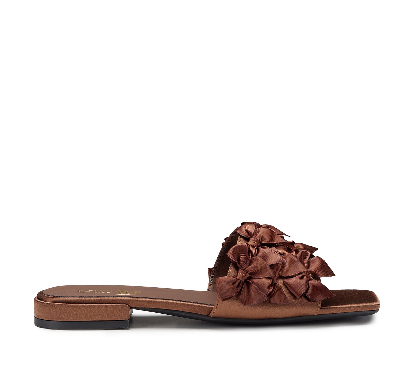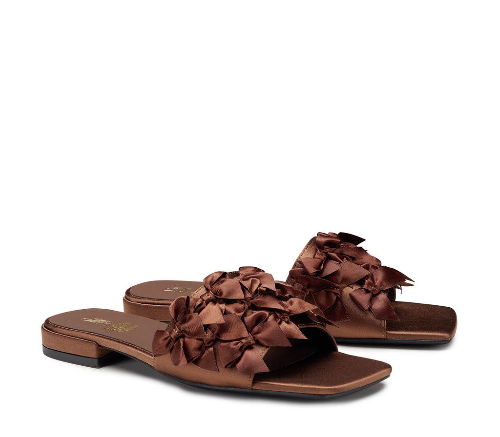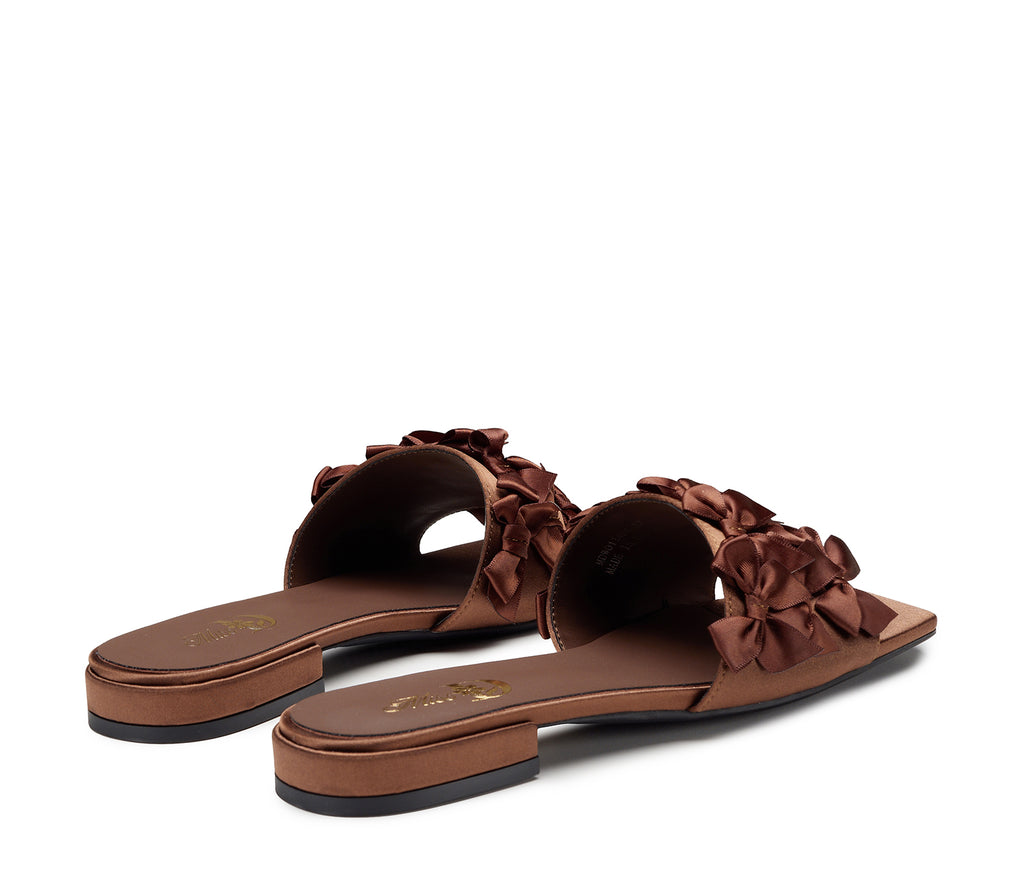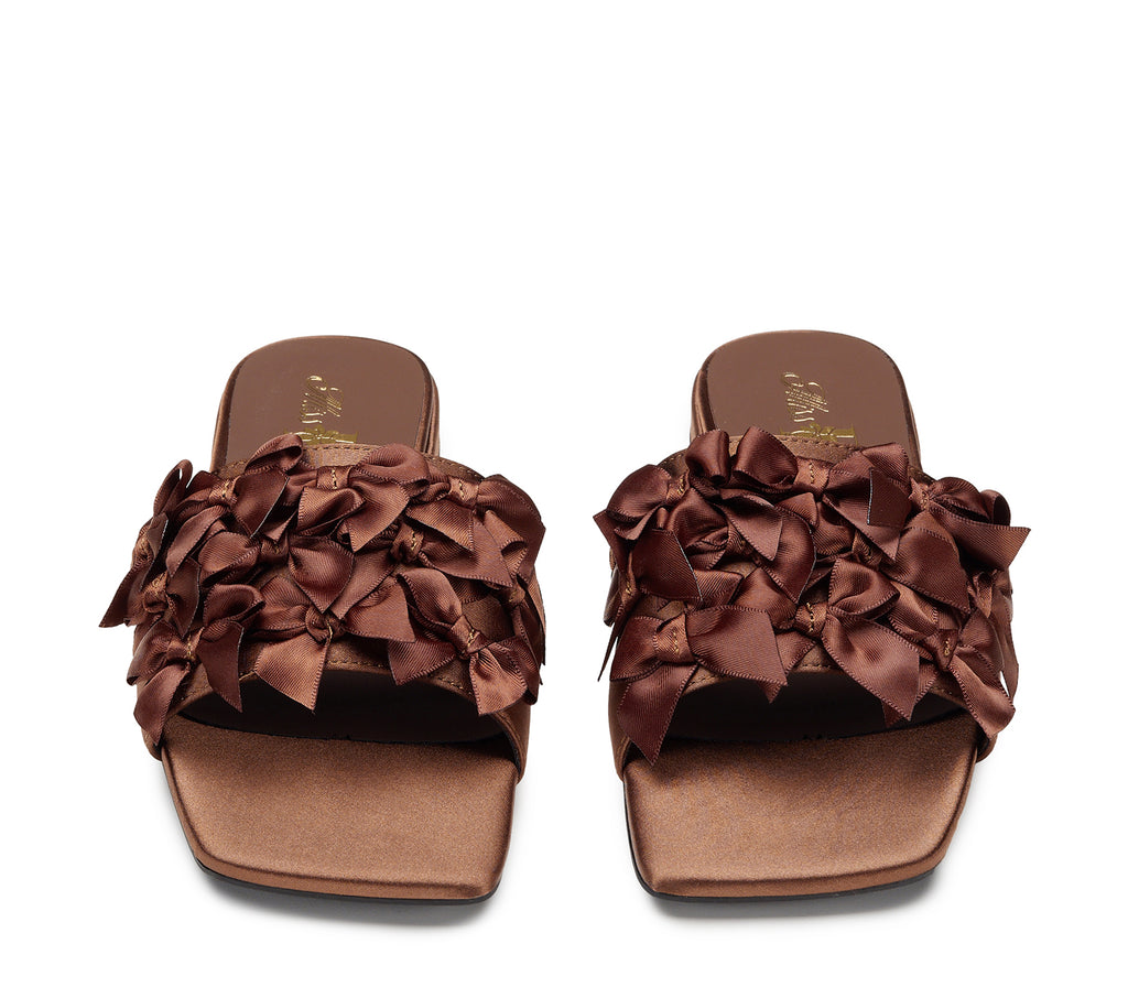 This bronze-tone sandal conquers with its bright texture and tone-on-tone satin bow decoration. The squared toe and the play of volumes give character and movement to the model, making it the ideal ally for special evenings or events where every detail makes a difference.