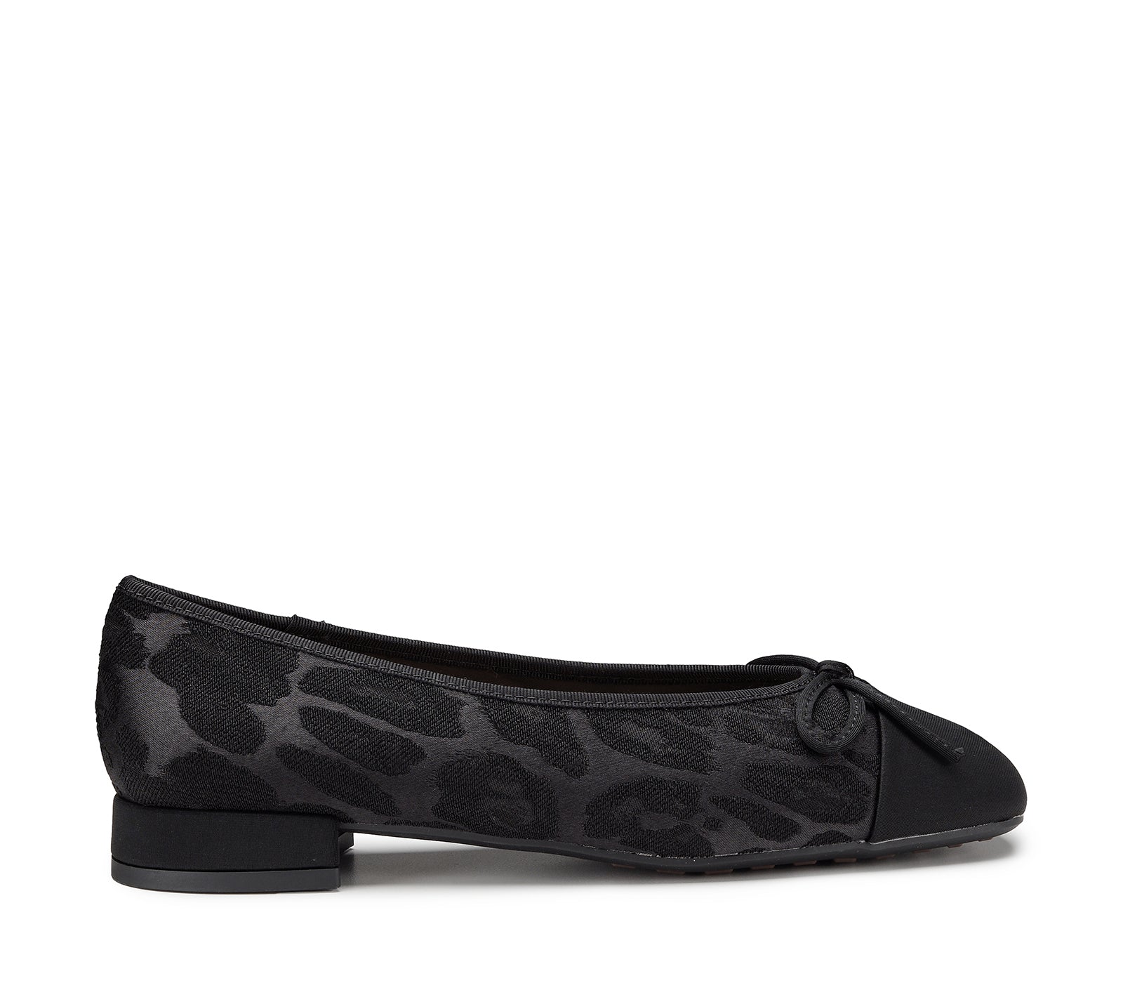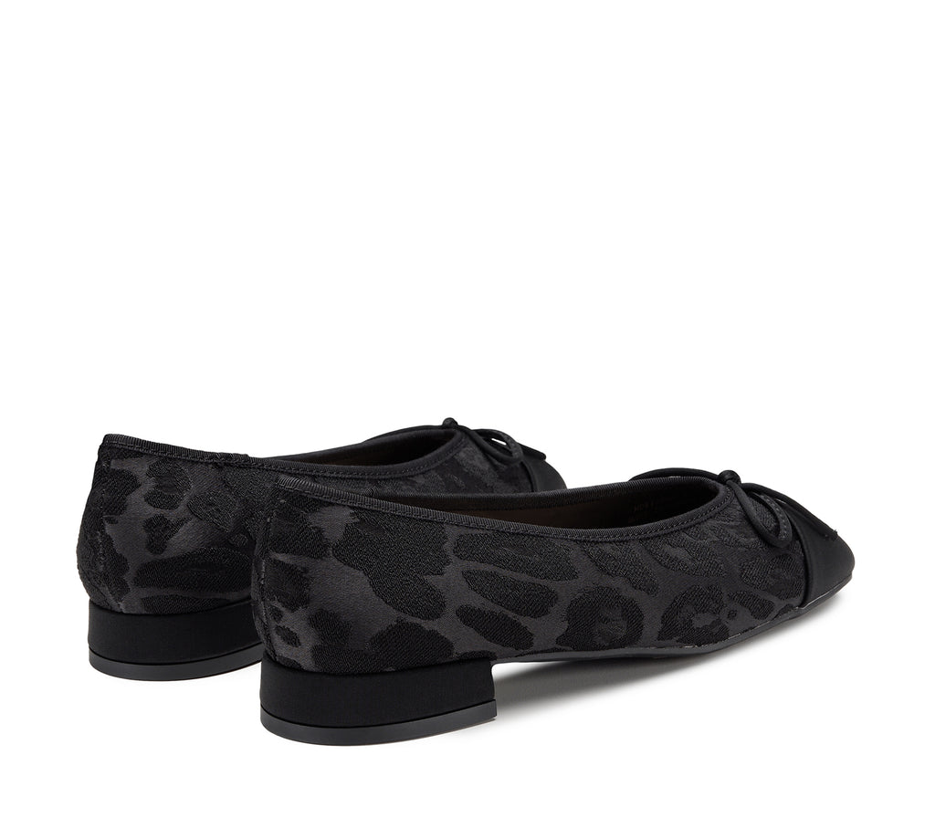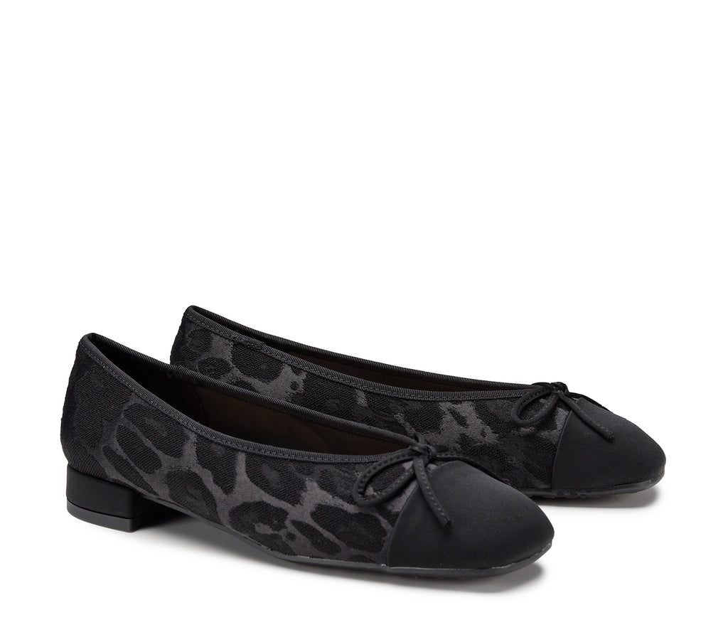 A classic model revisited in a bold key: this low-heeled ballerina combines practicality with the bold character of an animal pattern. The contrasting toe and small decorative bow give a touch of Parisian elegance, perfect for urban looks with an independent spirit.