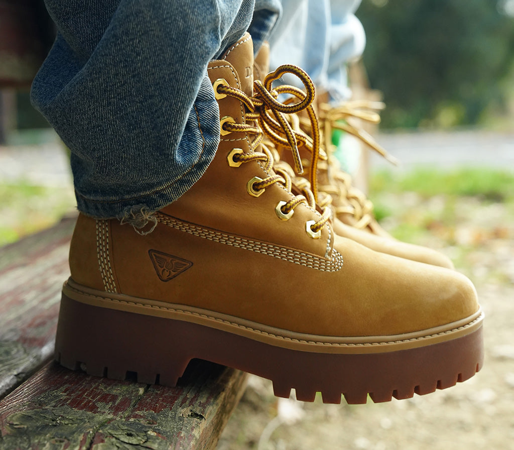 Yellow-colored nubuck boots with thick platform sole and pronounced tread. Upper features contrast stitching and metal eyelets for laces. Contrasting padded collar for original texture. The triangular logo, a distinctive element of the brand, is visible on the outer side.